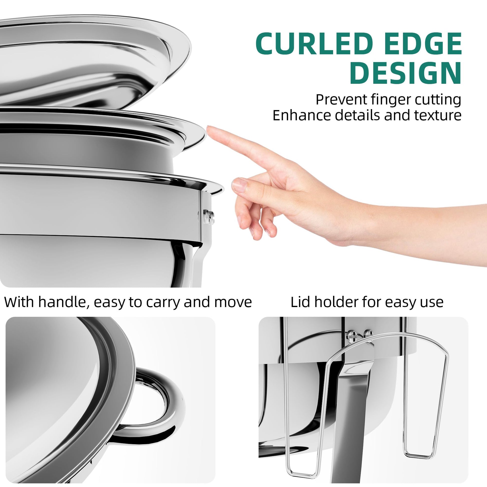 - More Thoughtful Design - Round chafing dishes for buffet with handles as well as lid holders are easier to use. Stackable storage for more space saving. Smooth edges for a softer touch and safer use. Easy to assemble and ready to use
