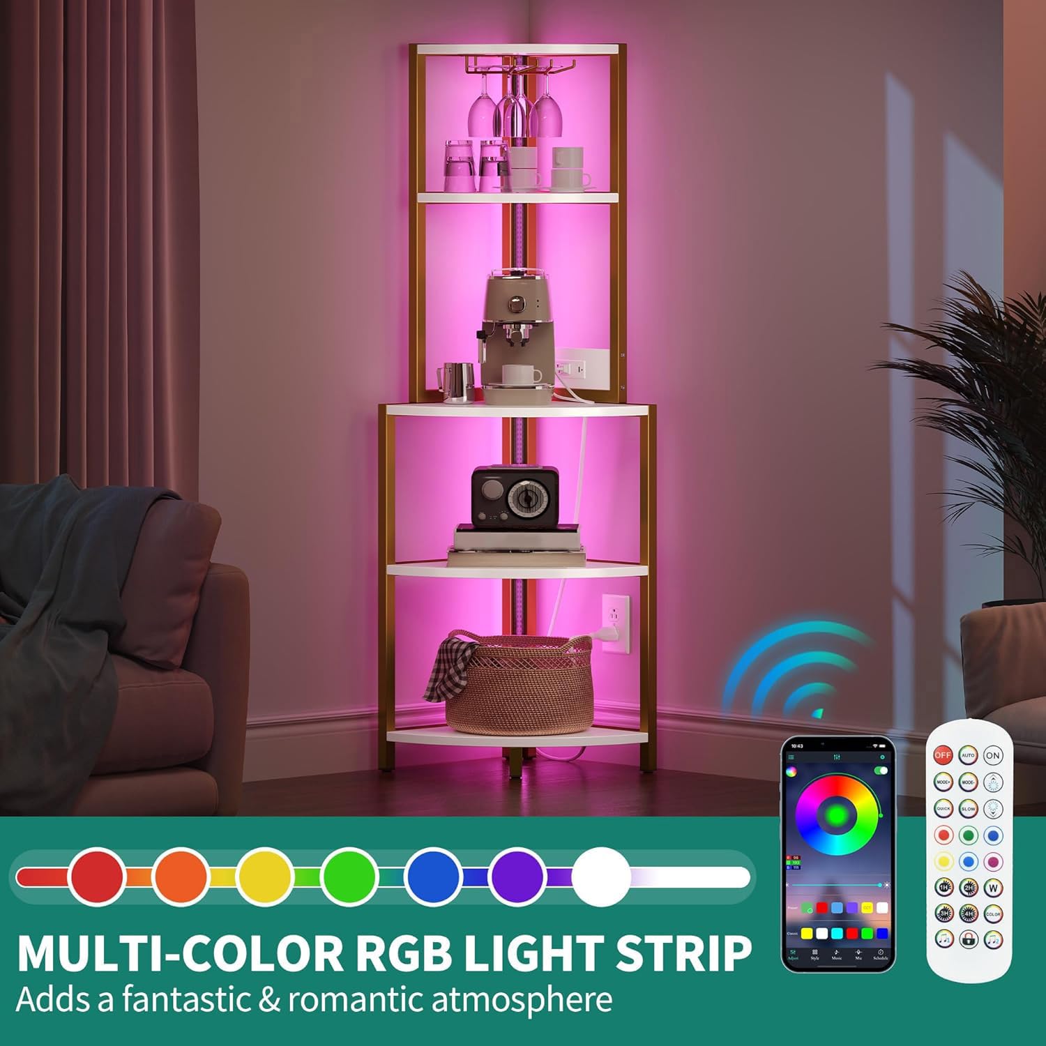 - LED light strips: The corner cabinet comes with a beautiful multi-color RGB LED light strip, which can be flexibly controlled by a phone app or remote control. With intelligent music synchronization function, the LED light color and flashing mode will change with the rhythm of your music.