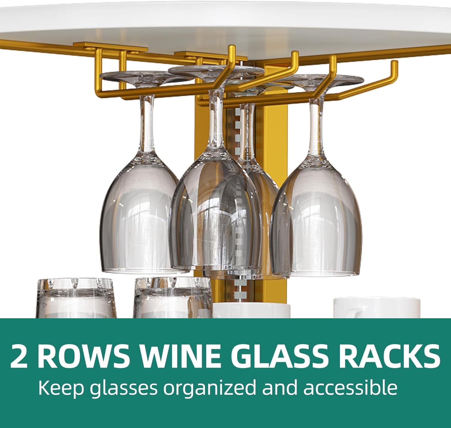 - Stored bar rack: With 2 rows of wine glass racks, you can hang your wine glasses to keep them neatly organized and easily accessible while preventing accidental collisions.