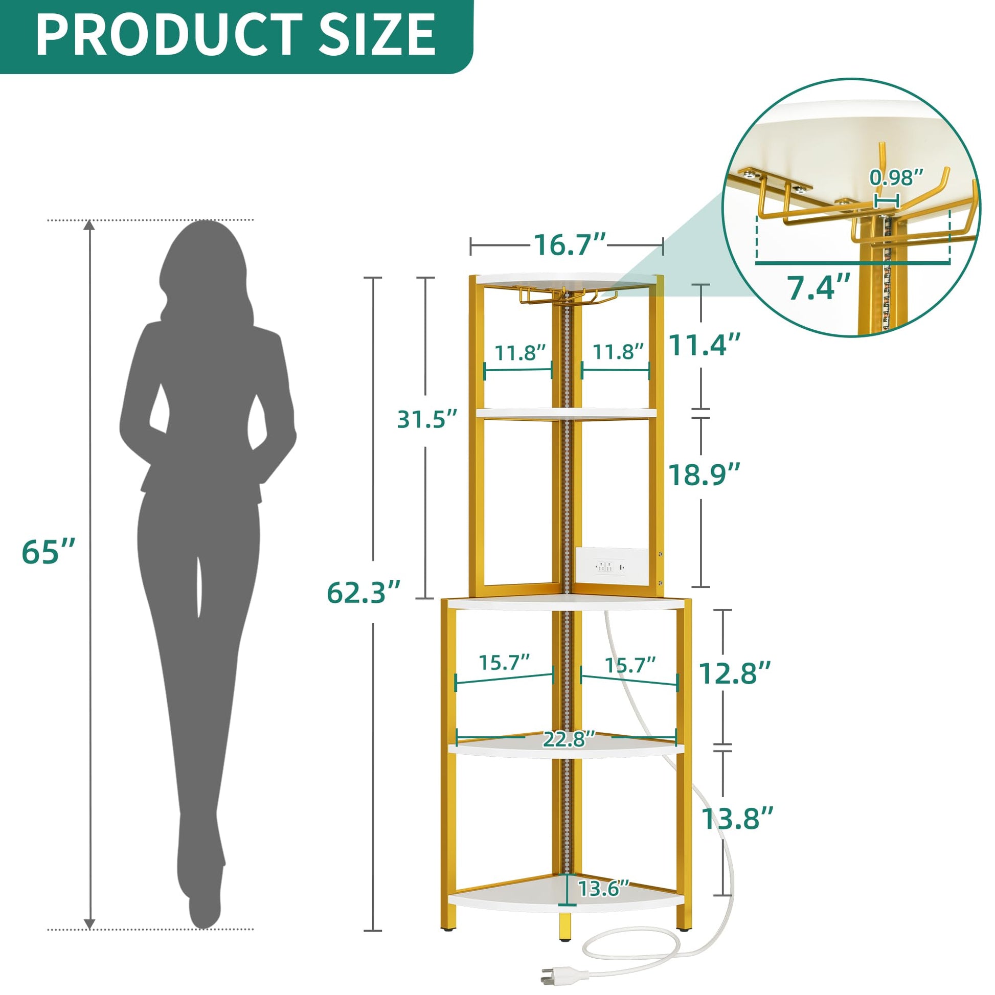 - Convenient charging station: This gold corner bookshelf features 2 outlets & a 6.56ft power cord, making it easy to charge small kitchen appliances and simplify your life.