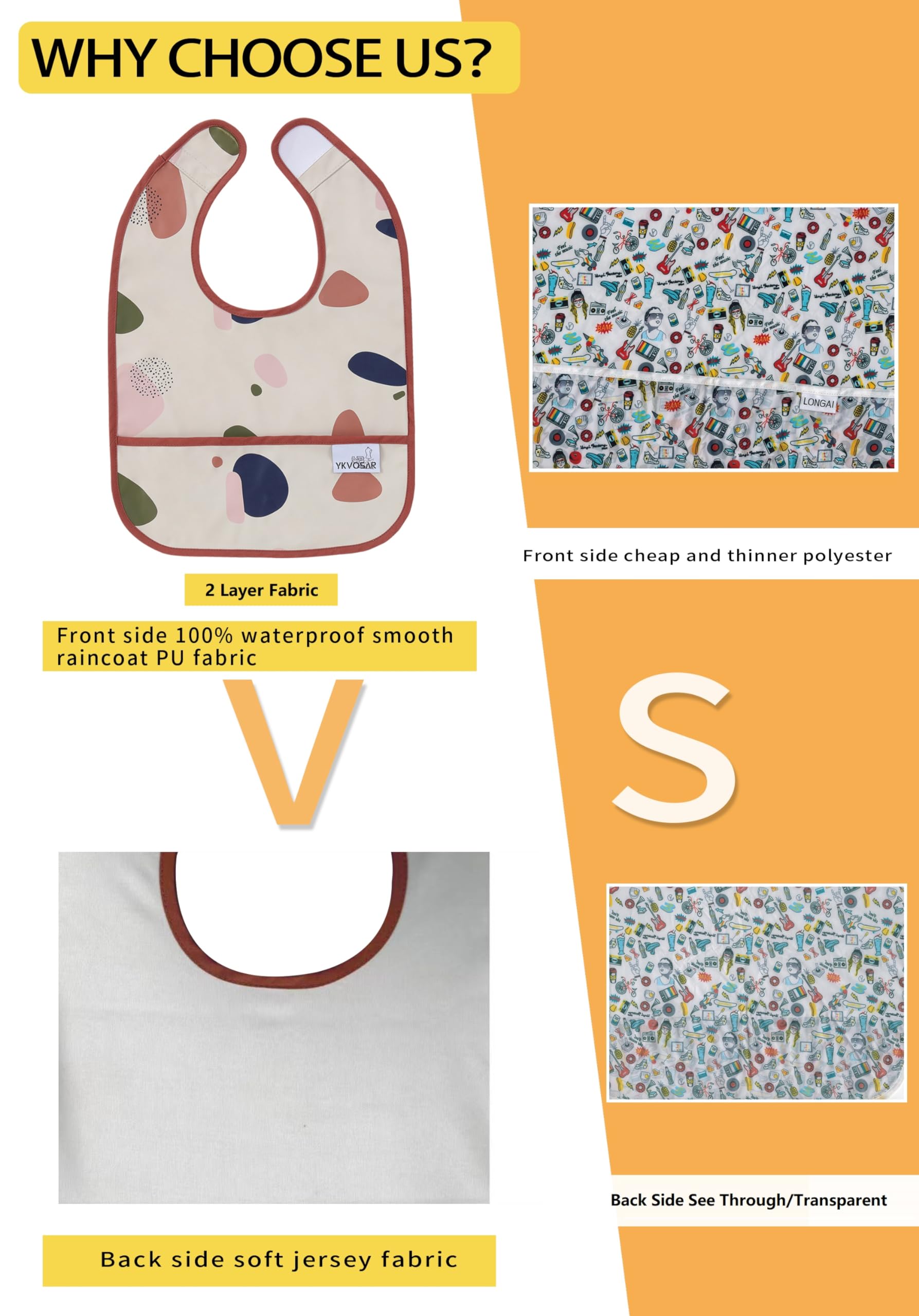 - YKVOSAR Baby bibs for eatting are soft polyester PU 2 layers fabric PFAS free with large pocket at the bottom catch dropped food and the runny yogurt,etc. nicely finished on edges adjustable velcro for neck