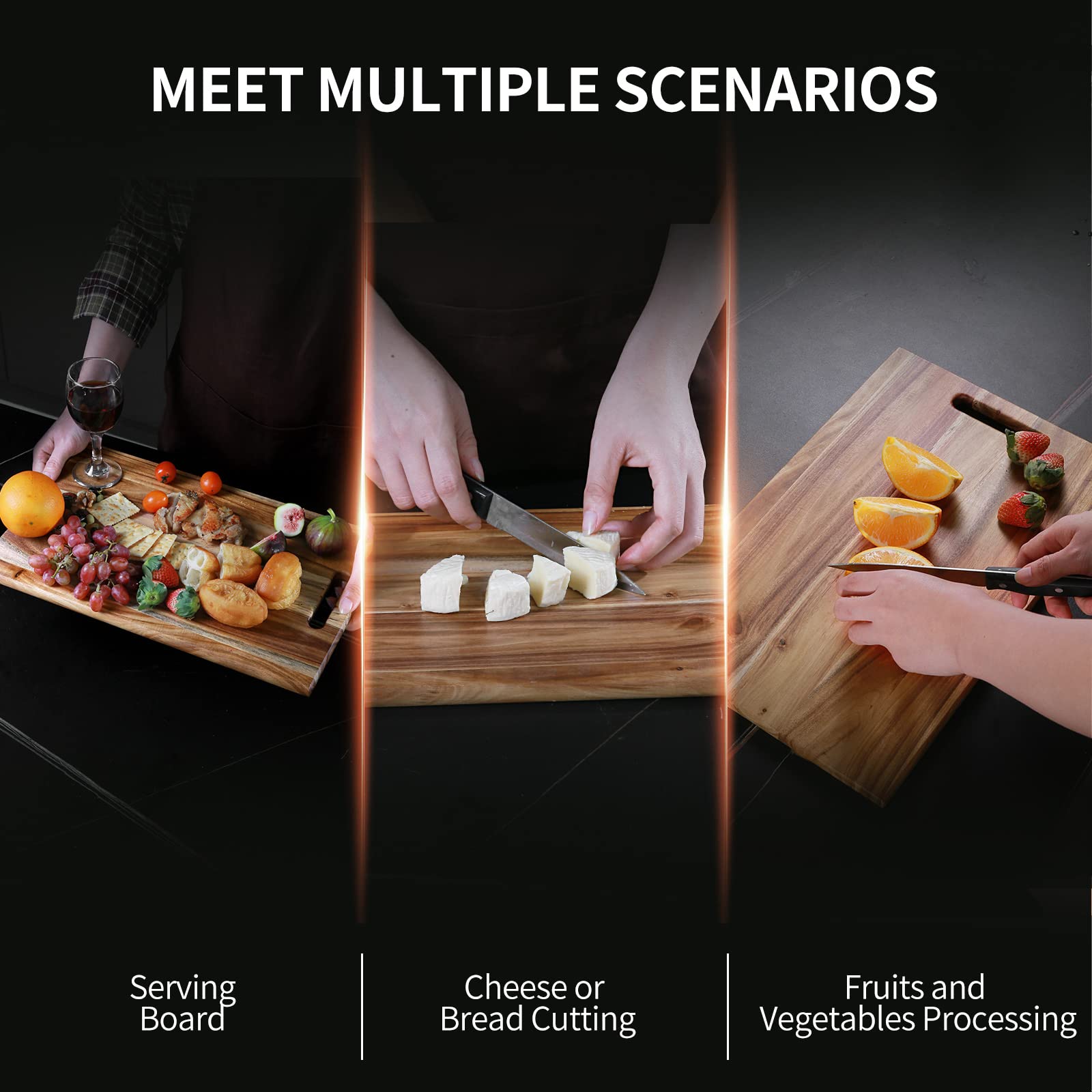 - Stylish and Versatile: The smooth polished edges showcase the natural beauty of acacia wood, making it more than just a cutting board. It can also double as a platter for serving cheese, meats, vegetables, bread, and other appetizers. It's a perfect choice for chopping, slicing, or displaying at festive gatherings and an ideal companion for summer barbecues or outdoor events.