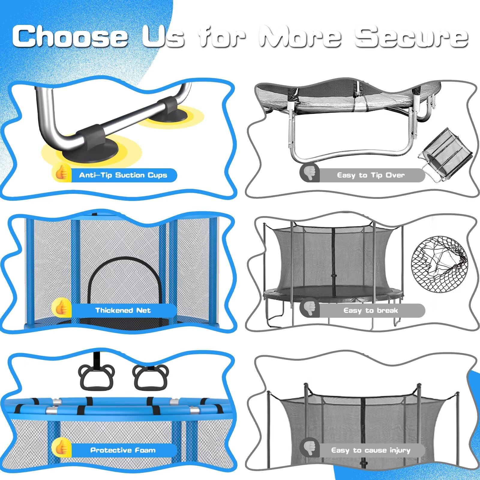 - Safe & Sturdy - Indoor trampoline for kids is built to last, with a thickened steel frame, 3 U-shaped legs with non-slip suction pads, and a 360° wrap-around safety pad. Plus, with dense safety netting and upgraded foam, it's a robust and secure space for your little ones to bounce and play.