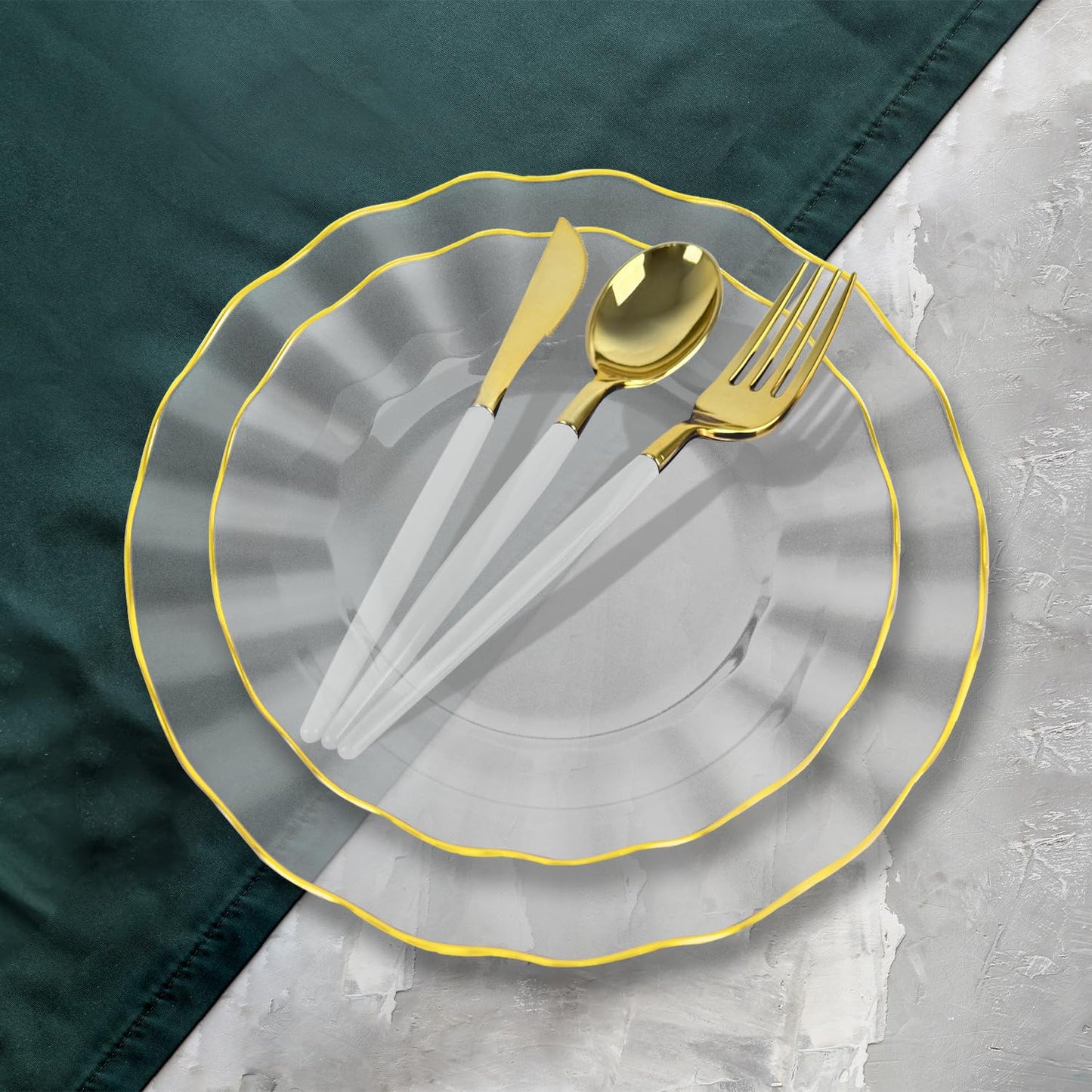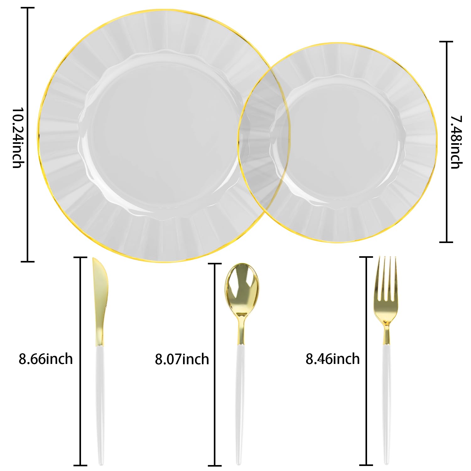 - Perfect 30 Guest Sets :These clear plastic plates with gold rim are perfect for 30 guests. It includes 30pcs 10.25inch dinner plates, 30pcs 7.5inch dessert plates, 30pcs plastic spoons, 30pcs plastic knives, 30pcs plastic forks. This clear plates with gold rim is ideal for any occasion, they are sturdy construction resists breakage, bending, and snapping.