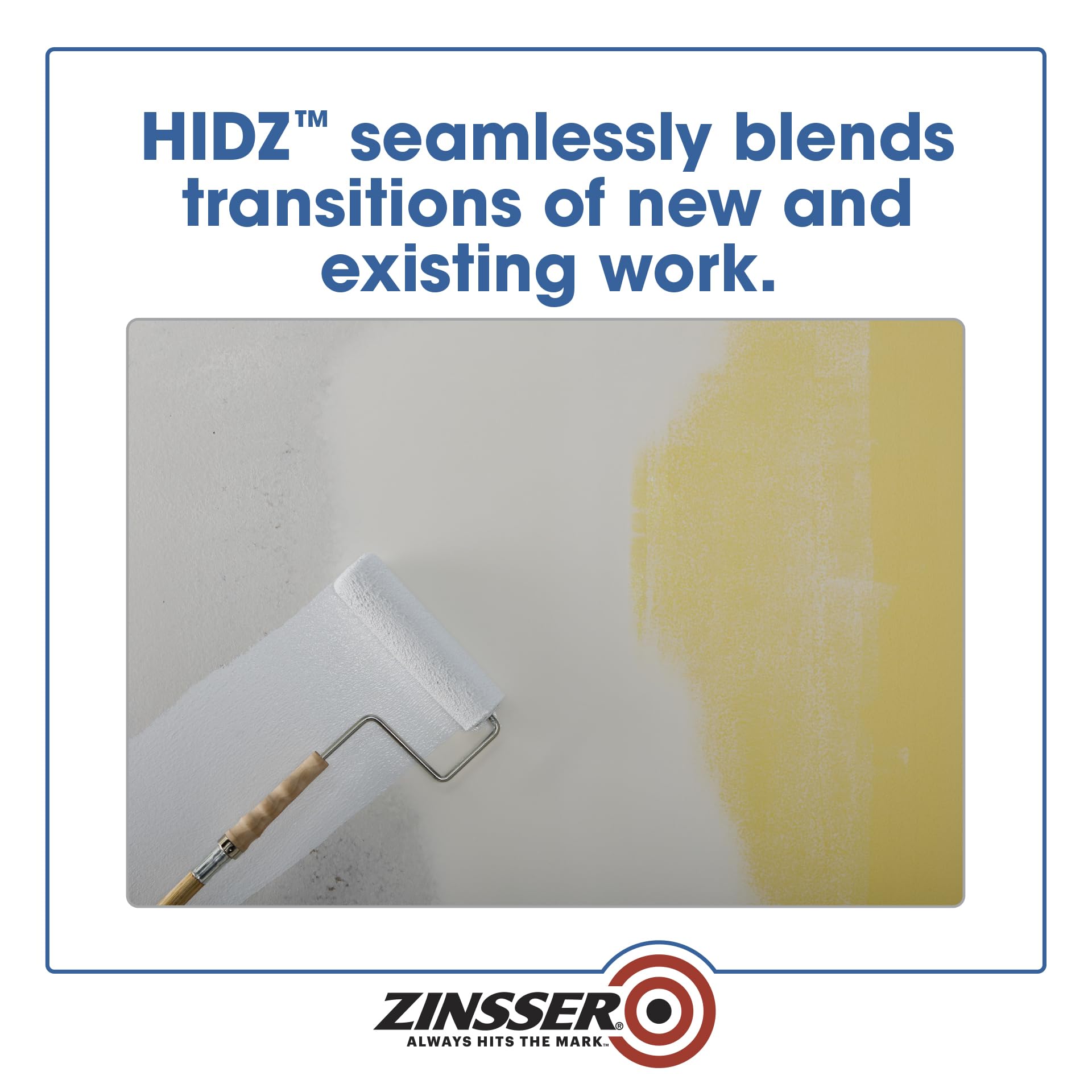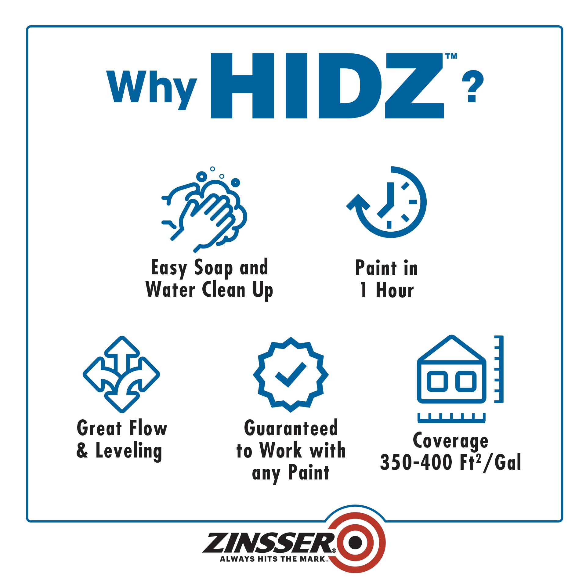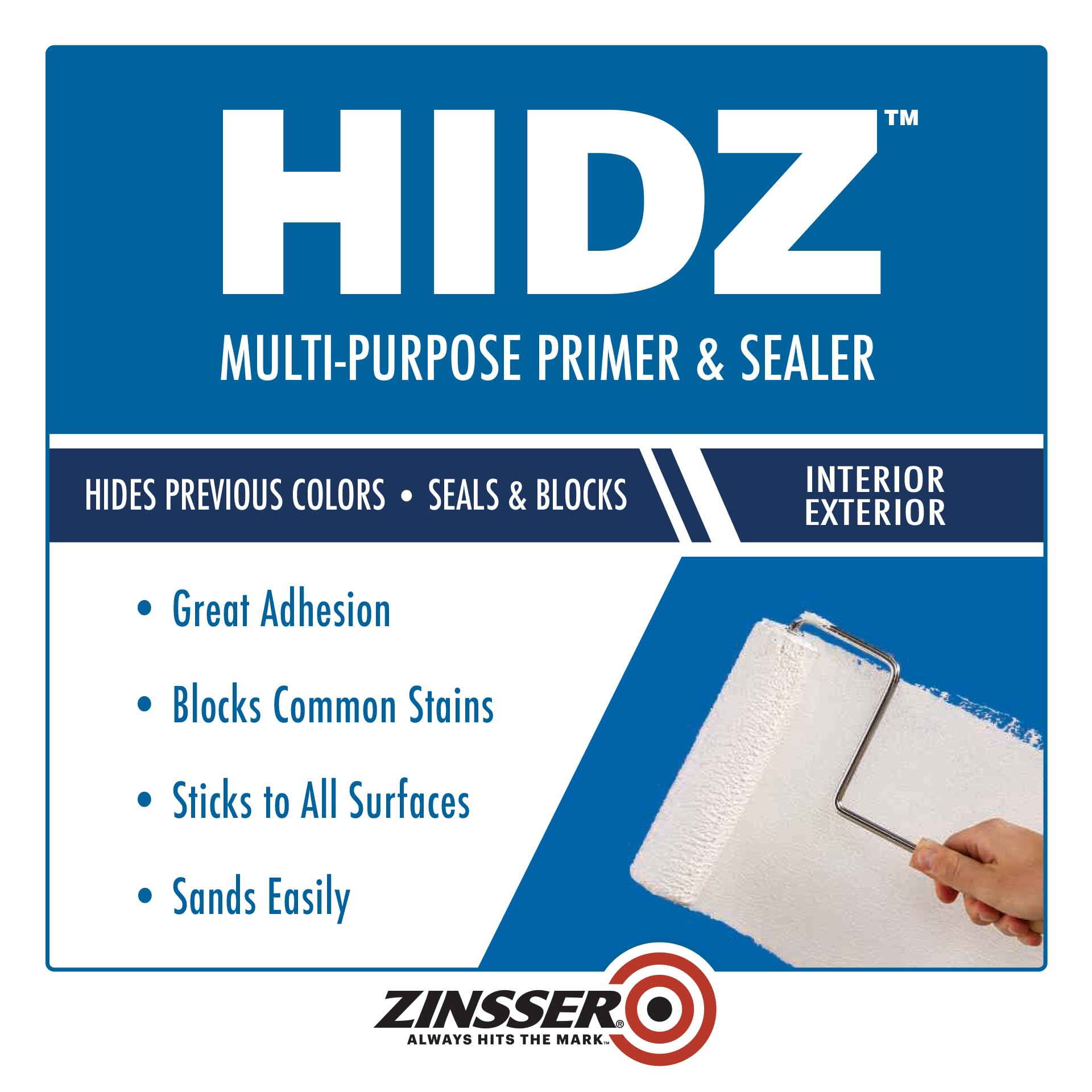 Details: Zinsser HIDZ Multi-Purpose Primer and Sealer is a water-based primer designed to hide common stains and seal porous interior and exterior surfaces. Perfect for remodeling and transitioning old, dark colors, Zinsser HIDZ has easy flow properties and sticks to nearly all surfaces. Sands easily and paintable in 1 hour for quick project completion.