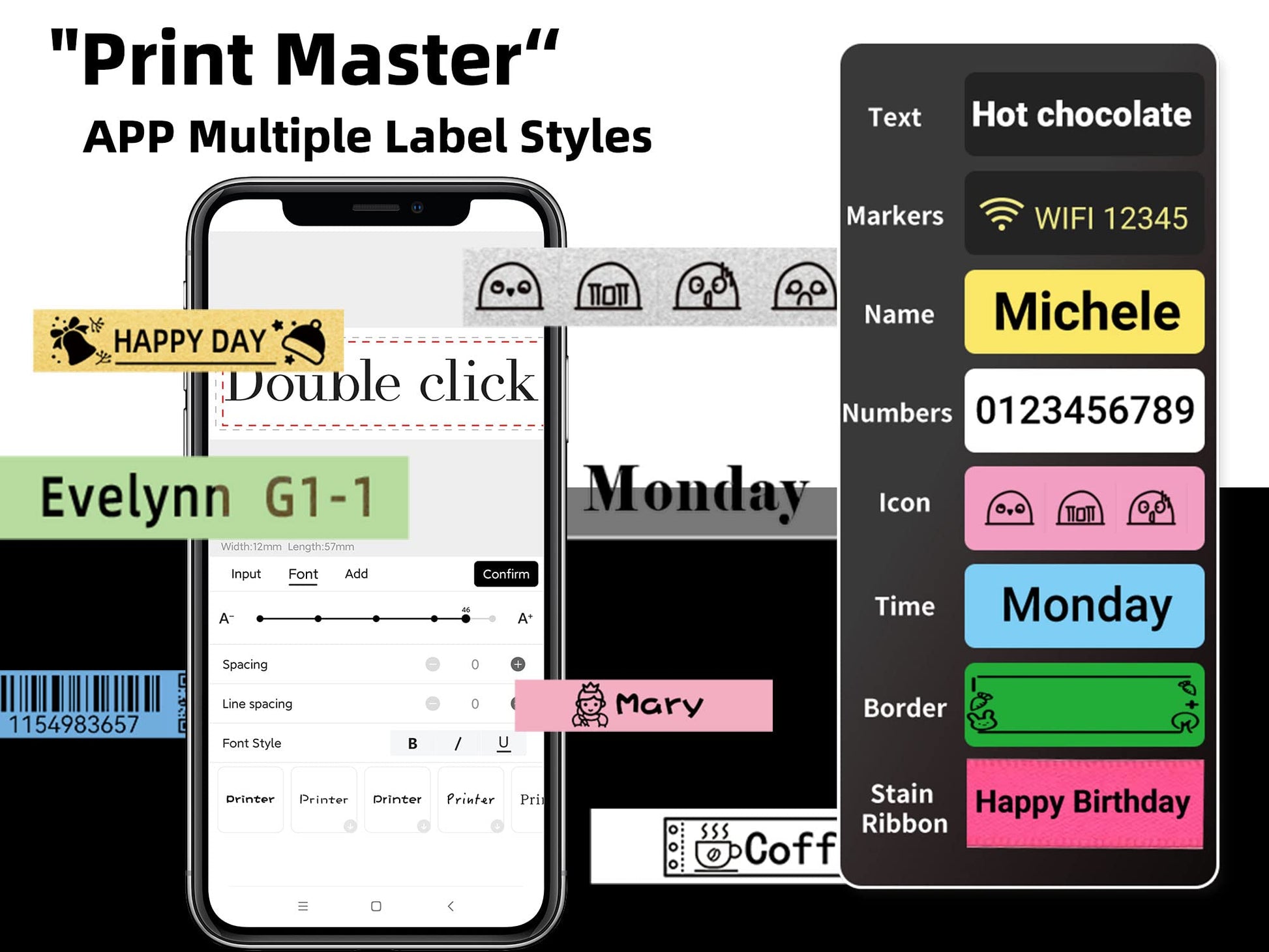 - 【A Good Label Designer】P12-Pro bluetooth label maker includes 1500+ icons, 270+ borders, 150+ fonts, 26 templates, 11 languages for you to design personalized labels. In addition, the app is updated from time to time with a large number of font styles, languages, icons and borders. You can also be an excellent label designer and have fun for it.