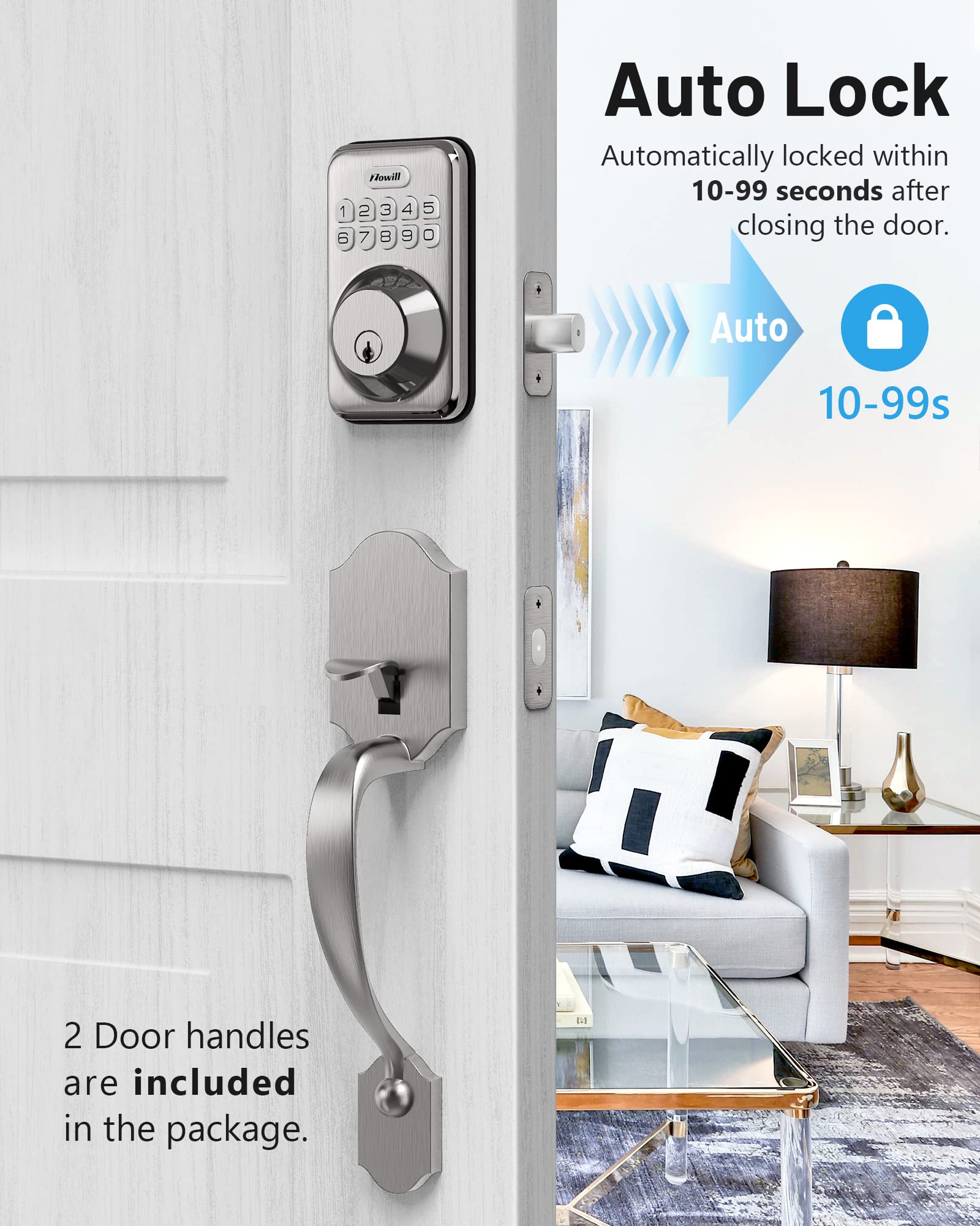 - Auto Lock & One Touch Lock : This keypad door lock with handle enables automatic locking for peace of mind, it automatically locks within 10-99 seconds of door closing to alleviate the stress of forgetting lock the door, or instantly locks your door by pressing and holding any button for 2 seconds when going out.